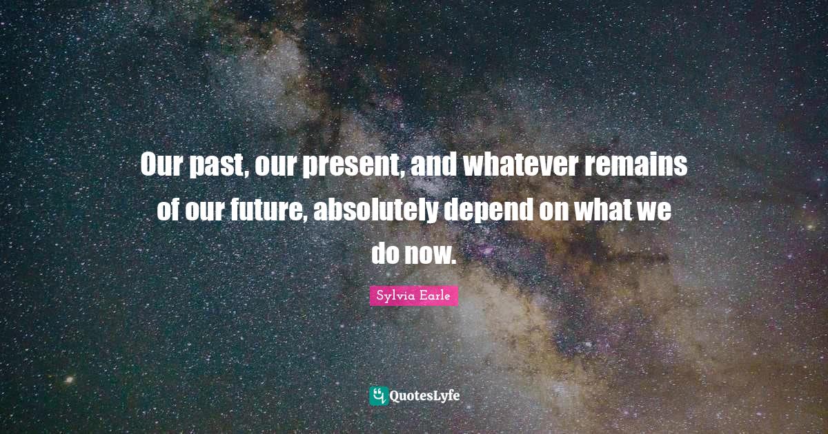 This page presents the quote "Our past, our present, and whatever remains of our future, absolutely depend on what we do now.". Author of this quote is Sylvia Earle. This quote is about our past, ocean, remains, sea, past, our future,.
