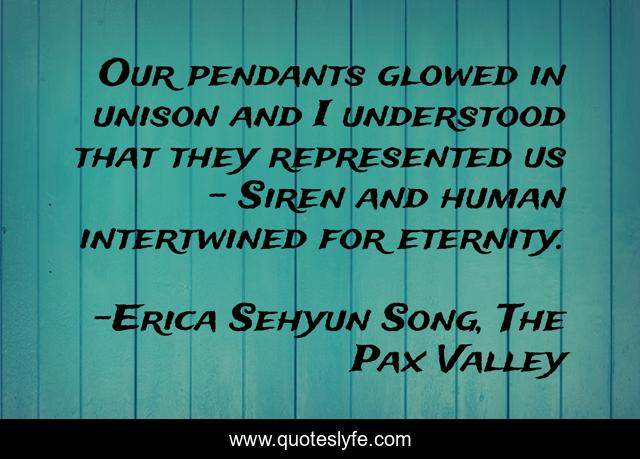 This page presents the quote "Our pendants glowed in unison and I understood that they represented us – Siren and human intertwined for eternity.". Author of this quote is Erica Sehyun Song, The Pax Valley. This quote is about fictions, fantasy-fiction, fantasy, fiction-writing, fiction-fantasy, adventures, fictional, fiction, fiction-novel,.