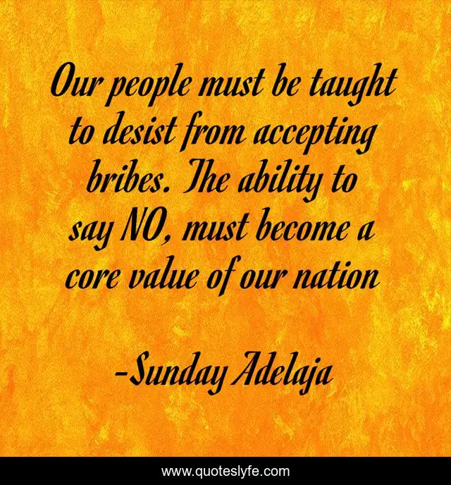 This page presents the quote "Our people must be taught to desist from accepting bribes. The ability to say NO, must become a core value of our nation". Author of this quote is Sunday Adelaja. This quote is about core, bribes, from, ability, no, people, value, nation, desist,.