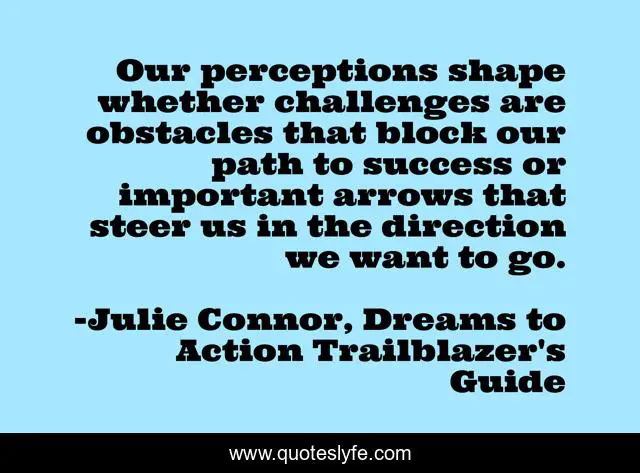 This page presents the quote "Our perceptions shape whether challenges are obstacles that block our path to success or important arrows that steer us in the direction we want to go.". Author of this quote is Julie Connor, Dreams to Action Trailblazer's Guide. This quote is about challenges, direction, perception, success,.