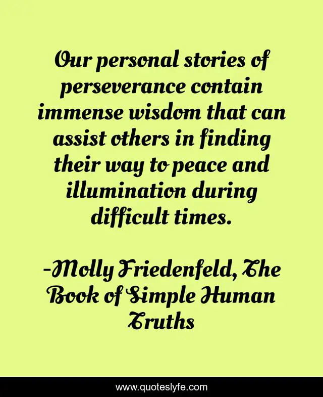 This page presents the quote "Our personal stories of perseverance contain immense wisdom that can assist others in finding their way to peace and illumination during difficult times.". Author of this quote is Molly Friedenfeld, The Book of Simple Human Truths. This quote is about perseverance, love, truth, inspirational, peace, wisdom, happiness, unconditional-love, illumination,.