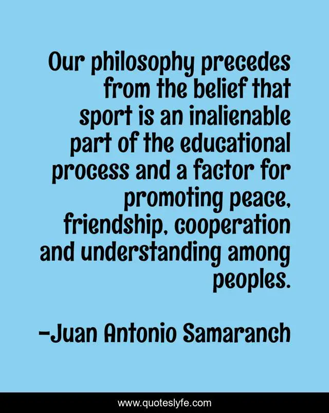 This page presents the quote "Our philosophy precedes from the belief that sport is an inalienable part of the educational process and a factor for promoting peace, friendship, cooperation and understanding among peoples.". Author of this quote is Juan Antonio Samaranch. This quote is about peace, philosophy,.