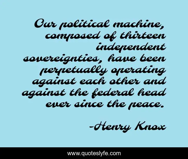 This page presents the quote "Our political machine, composed of thirteen independent sovereignties, have been perpetually operating against each other and against the federal head ever since the peace.". Author of this quote is Henry Knox. This quote is about independent, political,.