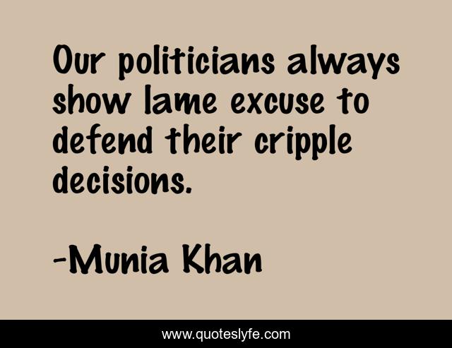 This page presents the quote "Our politicians always show lame excuse to defend their cripple decisions.". Author of this quote is Munia Khan. This quote is about political-humor, lame, always, decision, crippled, political, excuse, excuses, politicians,.