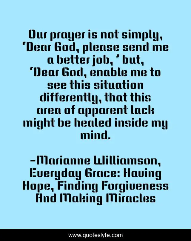 This page presents the quote "Our prayer is not simply, ‘Dear God, please send me a better job, ’ but, ‘Dear God, enable me to see this situation differently, that this area of apparent lack might be healed inside my mind.". Author of this quote is Marianne Williamson, Everyday Grace: Having Hope, Finding Forgiveness And Making Miracles. This quote is about job-seeking, unemployment, healing, inspirational, enthusiasm,.