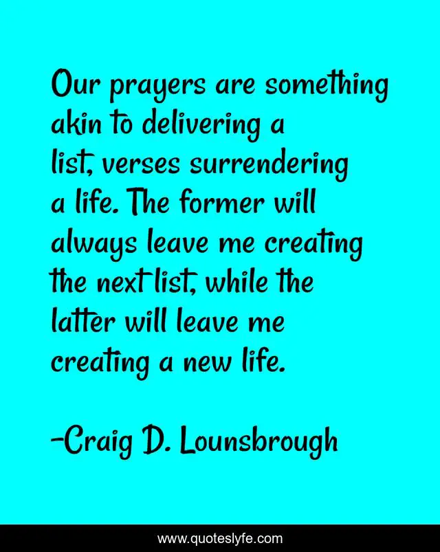 This page presents the quote "Our prayers are something akin to delivering a list, verses surrendering a life. The former will always leave me creating the next list, while the latter will leave me creating a new life.". Author of this quote is Craig D. Lounsbrough. This quote is about selfish, life, prayerful, christian, god, list, christianity, petitions, surrendering,.