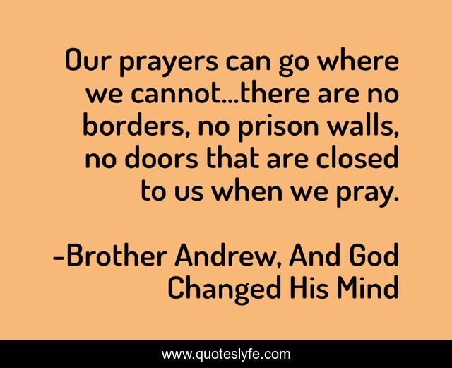 This page presents the quote "Our prayers can go where we cannot...there are no borders, no prison walls, no doors that are closed to us when we pray.". Author of this quote is Brother Andrew, And God Changed His Mind. This quote is about spirituality, religious, inspirational, enthusiasm,.