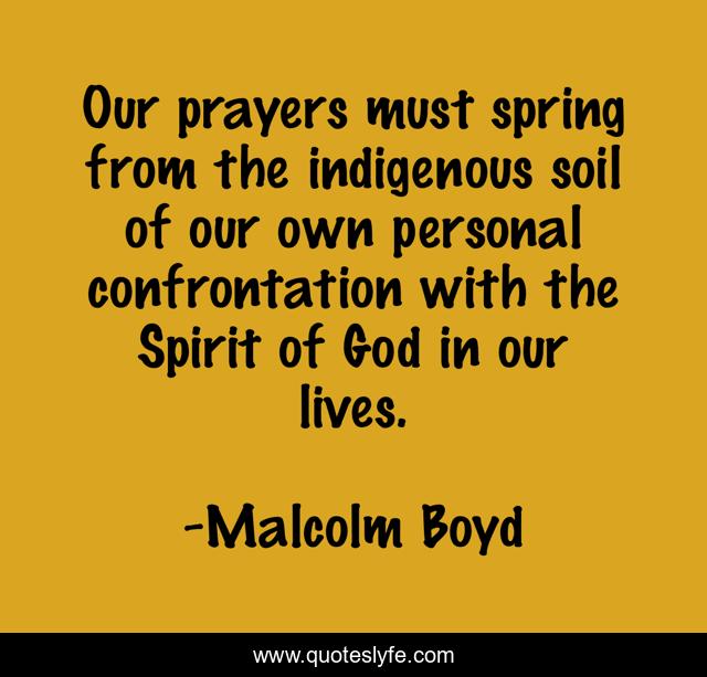 This page presents the quote "Our prayers must spring from the indigenous soil of our own personal confrontation with the Spirit of God in our lives.". Author of this quote is Malcolm Boyd. .