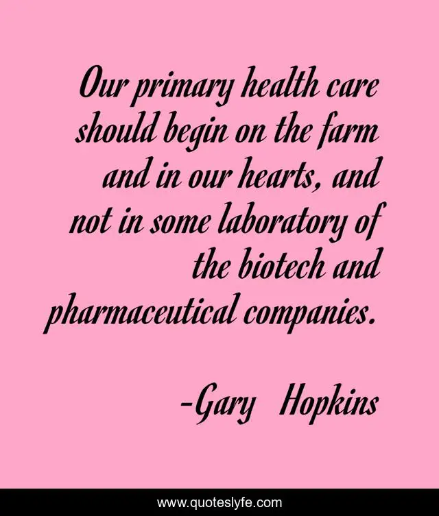 This page presents the quote "Our primary health care should begin on the farm and in our hearts, and not in some laboratory of the biotech and pharmaceutical companies.". Author of this quote is Gary Hopkins. This quote is about gmos, love, compassion, healthy-living, health-care, organic, common-sense, affection,.