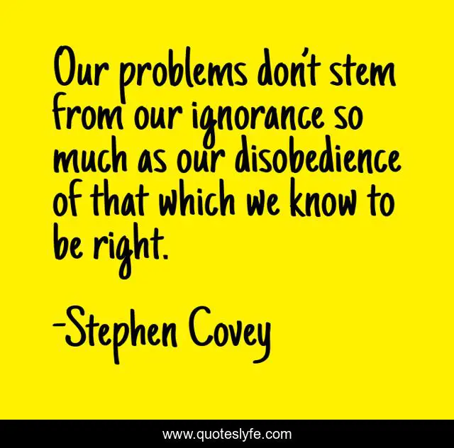 This page presents the quote "Our problems don’t stem from our ignorance so much as our disobedience of that which we know to be right.". Author of this quote is Stephen Covey. This quote is about spirituality, educational, motivation, self-improvement,.