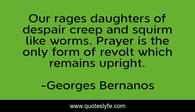 This page presents the quote "Our rages daughters of despair creep and squirm like worms. Prayer is the only form of revolt which remains upright.". Author of this quote is Georges Bernanos. .