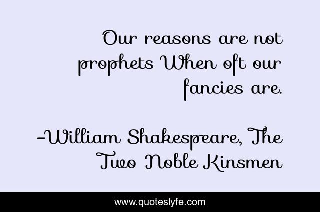 This page presents the quote "Our reasons are not prophets When oft our fancies are.". Author of this quote is William Shakespeare, The Two Noble Kinsmen. This quote is about reason, prediction,.
