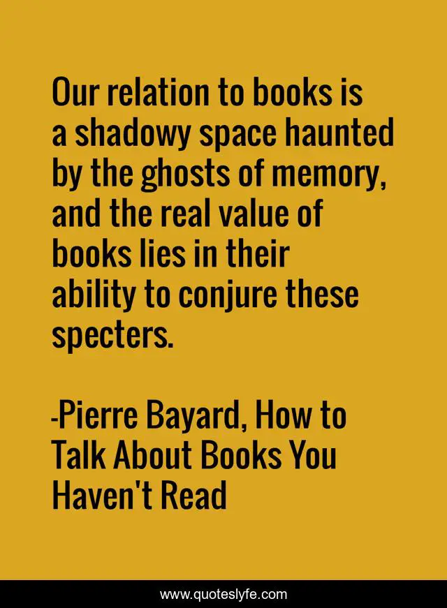 This page presents the quote "Our relation to books is a shadowy space haunted by the ghosts of memory, and the real value of books lies in their ability to conjure these specters.". Author of this quote is Pierre Bayard, How to Talk About Books You Haven't Read. This quote is about books, reading,.