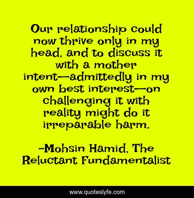 This page presents the quote "Our relationship could now thrive only in my head, and to discuss it with a mother intent—admittedly in my own best interest—on challenging it with reality might do it irreparable harm.". Author of this quote is Mohsin Hamid, The Reluctant Fundamentalist. This quote is about relationships, memories, love, thoughts, affection,.