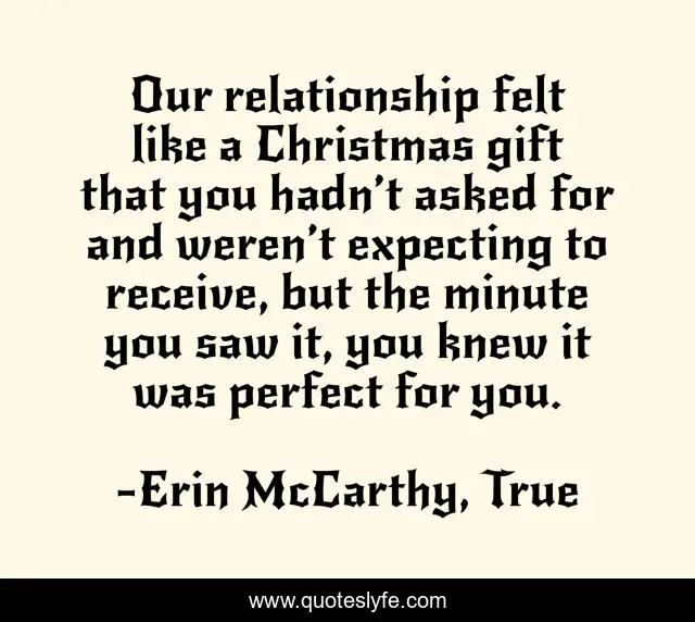 This page presents the quote "Our relationship felt like a Christmas gift that you hadn’t asked for and weren’t expecting to receive, but the minute you saw it, you knew it was perfect for you.". Author of this quote is Erin McCarthy, True. .