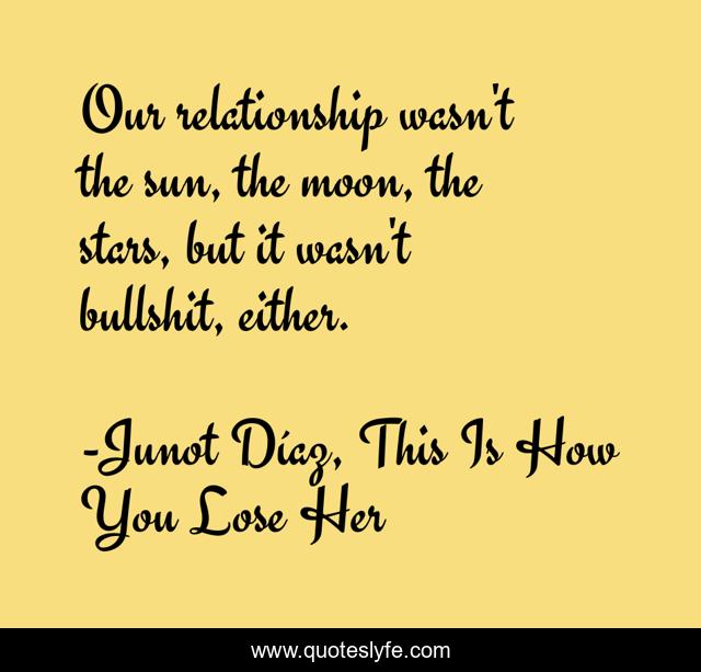 This page presents the quote "Our relationship wasn't the sun, the moon, the stars, but it wasn't bullshit, either.". Author of this quote is Junot Díaz, This Is How You Lose Her. This quote is about romance, humour,.