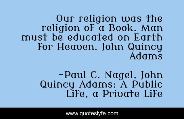 This page presents the quote "Our religion was the religion of a Book. Man must be educated on Earth for Heaven. John Quincy Adams". Author of this quote is Paul C. Nagel, John Quincy Adams: A Public Life, a Private Life. This quote is about culture, civil-discourse, bible, exposition,.