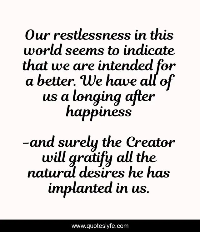 This page presents the quote "Our restlessness in this world seems to indicate that we are intended for a better. We have all of us a longing after happiness". Author of this quote is and surely the Creator will gratify all the natural desires he has implanted in us.. .