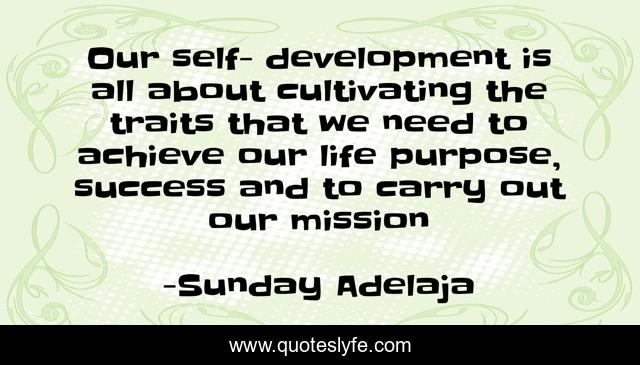 This page presents the quote "Our self- development is all about cultivating the traits that we need to achieve our life purpose, success and to carry out our mission". Author of this quote is Sunday Adelaja. This quote is about life, success, mission, self-development, life-purpose, cultivation, purpose, truth, calling,.