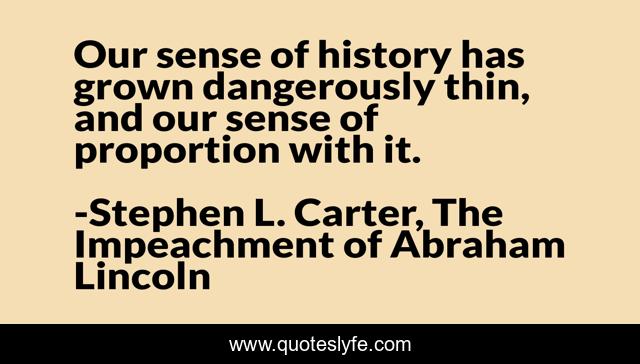 This page presents the quote "Our sense of history has grown dangerously thin, and our sense of proportion with it.". Author of this quote is Stephen L. Carter, The Impeachment of Abraham Lincoln. This quote is about emotion, perspective, exaggeration,.