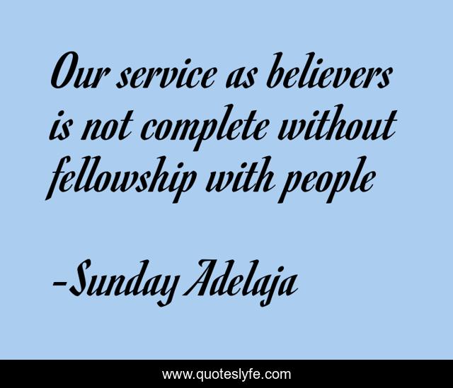 This page presents the quote "Our service as believers is not complete without fellowship with people". Author of this quote is Sunday Adelaja. This quote is about love, people, money, principles, employment, worship, destiny, service, god,.