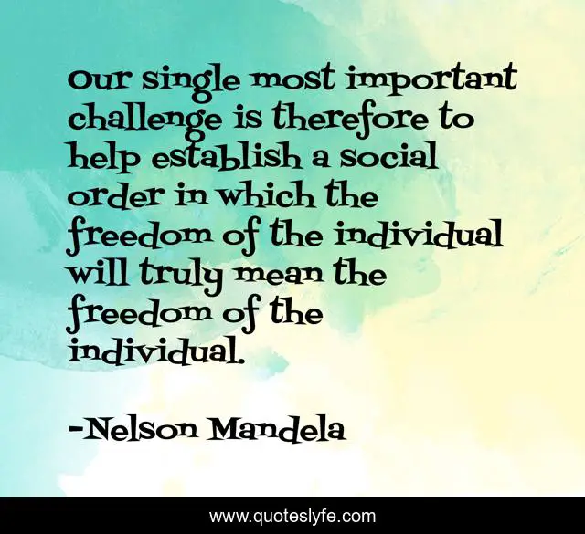 This page presents the quote "Our single most important challenge is therefore to help establish a social order in which the freedom of the individual will truly mean the freedom of the individual.". Author of this quote is Nelson Mandela. This quote is about challenge, important, help,.