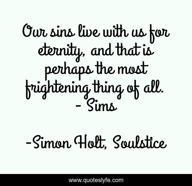 This page presents the quote "Our sins live with us for eternity, and that is perhaps the most frightening thing of all. - Sims". Author of this quote is Simon Holt, Soulstice. This quote is about eternity, frightening, sins,.