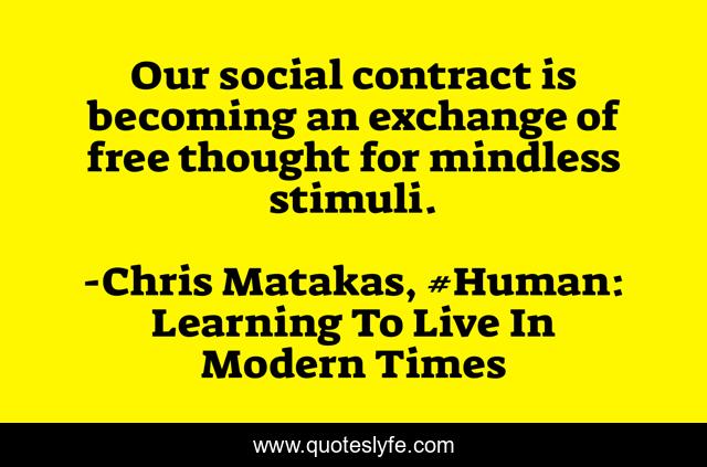 This page presents the quote "Our social contract is becoming an exchange of free thought for mindless stimuli.". Author of this quote is Chris Matakas, #Human: Learning To Live In Modern Times. This quote is about awarness, thought, social-contract,.