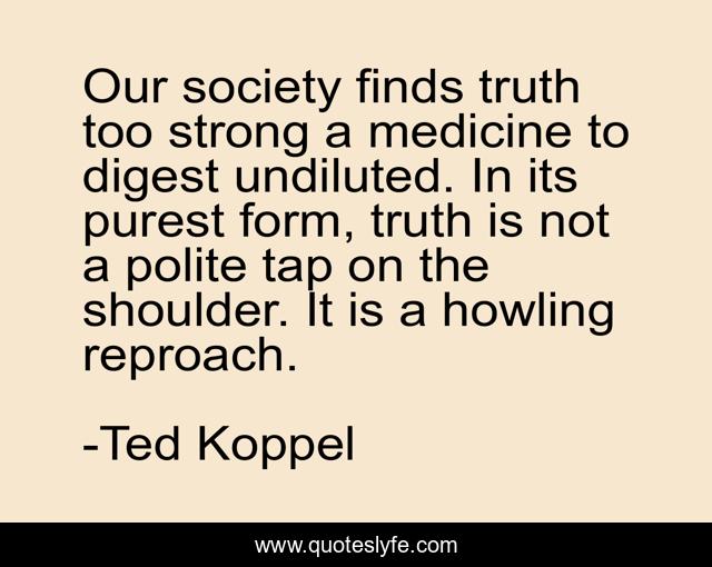 This page presents the quote "Our society finds truth too strong a medicine to digest undiluted. In its purest form, truth is not a polite tap on the shoulder. It is a howling reproach.". Author of this quote is Ted Koppel. This quote is about strong, truth is, truth,.