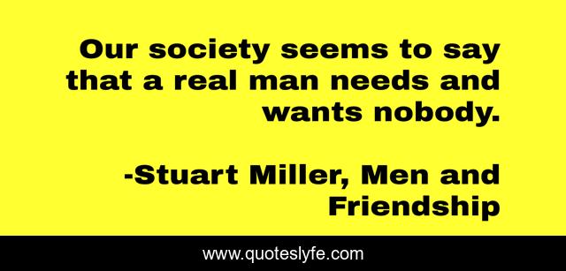 This page presents the quote "Our society seems to say that a real man needs and wants nobody.". Author of this quote is Stuart Miller, Men and Friendship. .