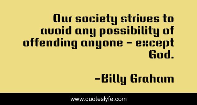 This page presents the quote "Our society strives to avoid any possibility of offending anyone - except God.". Author of this quote is Billy Graham. This quote is about society, avoid, offending,.