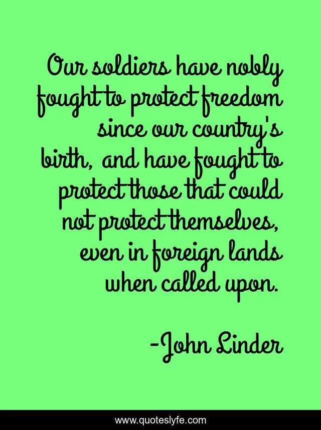 This page presents the quote "Our soldiers have nobly fought to protect freedom since our country's birth, and have fought to protect those that could not protect themselves, even in foreign lands when called upon.". Author of this quote is John Linder. This quote is about freedom, birth, country,.