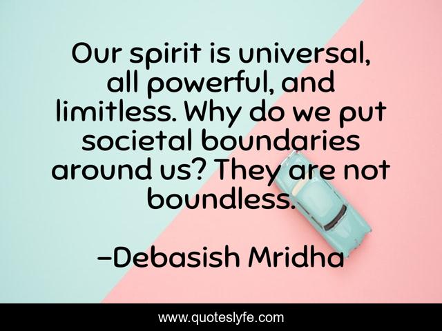 This page presents the quote "Our spirit is universal, all powerful, and limitless. Why do we put societal boundaries around us? They are not boundless.". Author of this quote is Debasish Mridha. This quote is about life, love, knowledge, inspirational, intelligence, philosophy, wisdom, quotes, affection,.