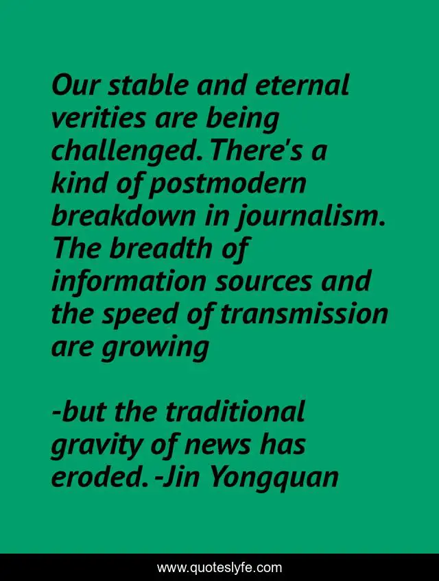 "but the traditional gravity of news has eroded. -Jin Yongquan Quotes." Quoteslyfe.com, 2025. Fri. 05 Dec. 2025. <https://www.quoteslyfe.com/quote/Our-stable-and-eternal-verities-are-being-205420>.