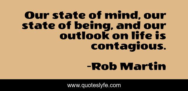 This page presents the quote "Our state of mind, our state of being, and our outlook on life is contagious.". Author of this quote is Rob Martin. This quote is about gratitude, self-awareness, book, gratitude-happiness-inner-peace, inspirational, self-help, enthusiasm, gratitude-life-happiness-success,.