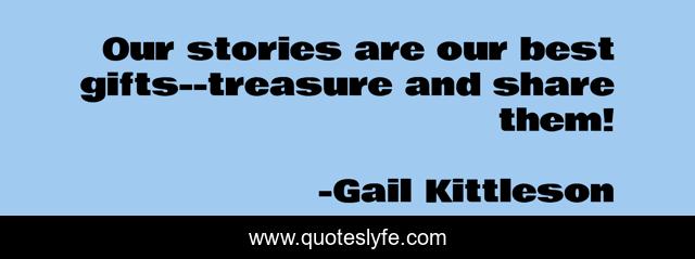 This page presents the quote "Our stories are our best gifts--treasure and share them!". Author of this quote is Gail Kittleson. This quote is about writing-life, stories, memoir,.
