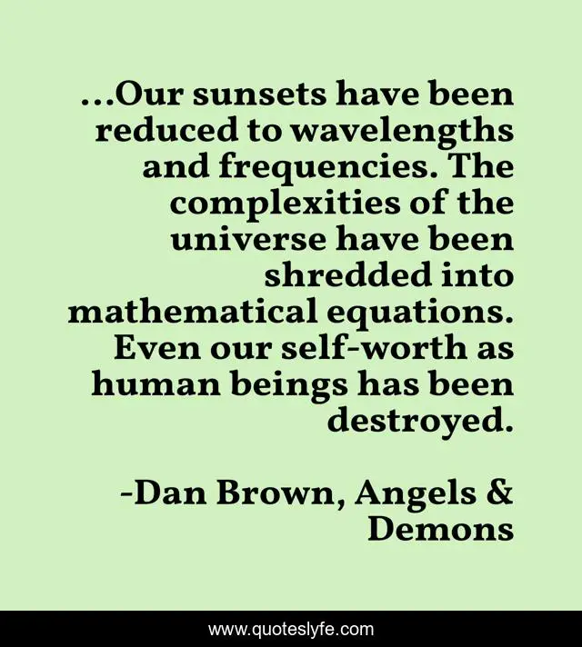 This page presents the quote "…Our sunsets have been reduced to wavelengths and frequencies. The complexities of the universe have been shredded into mathematical equations. Even our self-worth as human beings has been destroyed.". Author of this quote is Dan Brown, Angels & Demons. This quote is about science, meaning, science-and-religion,.