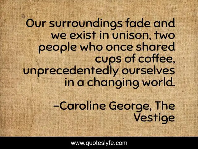 This page presents the quote "Our surroundings fade and we exist in unison, two people who once shared cups of coffee, unprecedentedly ourselves in a changing world.". Author of this quote is Caroline George, The Vestige. This quote is about the-end-of-the-world, coffee, love, relationship, couple, romance, change, kiss, fall-in-love,.