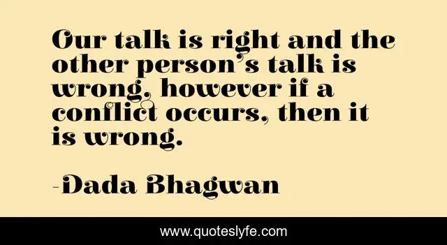 This page presents the quote "Our talk is right and the other person’s talk is wrong, however if a conflict occurs, then it is wrong.". Author of this quote is Dada Bhagwan. This quote is about person, spiritual, wrong-right, conflict,.