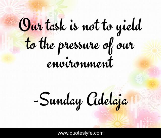 This page presents the quote "Our task is not to yield to the pressure of our environment". Author of this quote is Sunday Adelaja. This quote is about life, task, calling, environment, pressure, purpose, truth,.