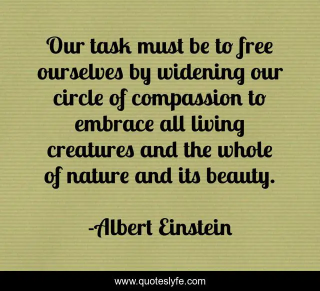 This page presents the quote "Our task must be to free ourselves by widening our circle of compassion to embrace all living creatures and the whole of nature and its beauty.". Author of this quote is Albert Einstein. This quote is about compassion, beauty, free,.