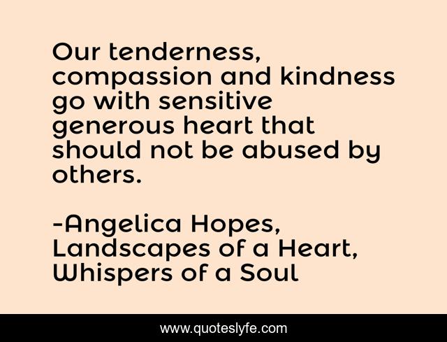 This page presents the quote "Our tenderness, compassion and kindness go with sensitive generous heart that should not be abused by others.". Author of this quote is Angelica Hopes, Landscapes of a Heart, Whispers of a Soul. This quote is about compassion, respect, abuse, goodness, violence,.