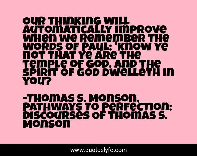 This page presents the quote "Our thinking will automatically improve when we remember the words of Paul: 'know ye not that ye are the temple of God, and the spirit of God dwelleth in you?". Author of this quote is Thomas S. Monson, Pathways To Perfection: Discourses Of Thomas S. Monson. This quote is about thinking, self, self-respect, temple,.