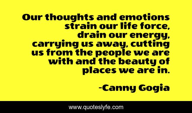 This page presents the quote "Our thoughts and emotions strain our life force, drain our energy, carrying us away, cutting us from the people we are with and the beauty of places we are in.". Author of this quote is Canny Gogia. This quote is about enthusiasm, inspirational,.