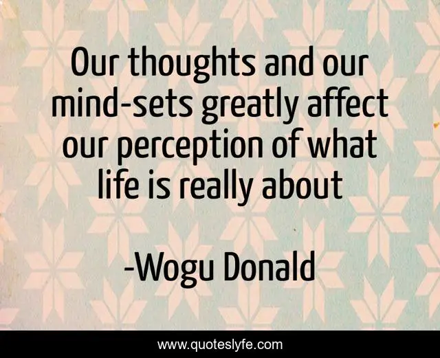 This page presents the quote "Our thoughts and our mind-sets greatly affect our perception of what life is really about". Author of this quote is Wogu Donald. This quote is about relationships, enthusiasm, education, inspirational, entrepreneurship,.