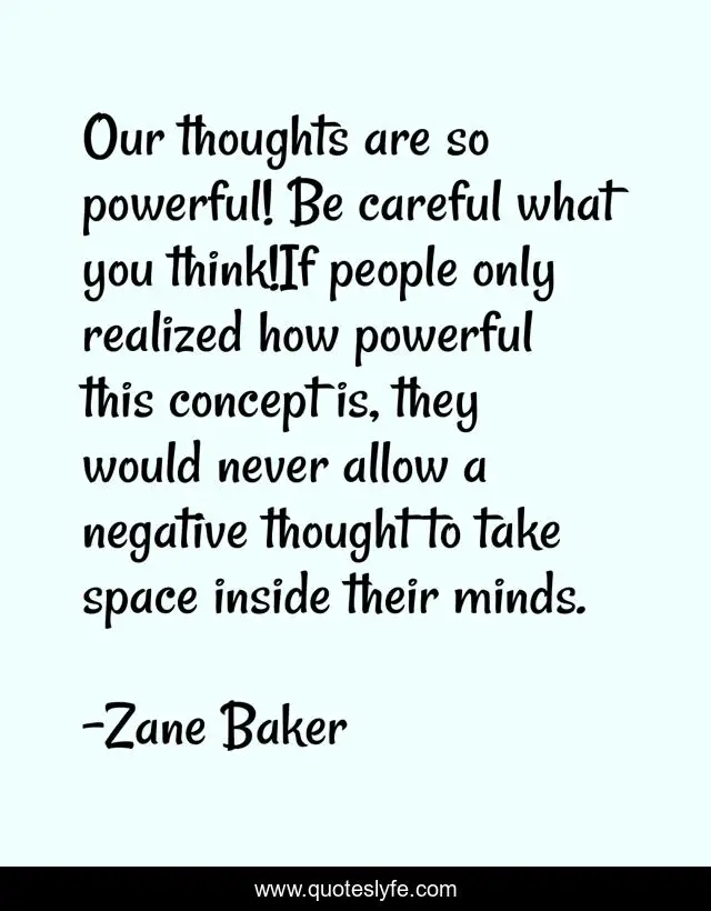 This page presents the quote "Our thoughts are so powerful! Be careful what you think!If people only realized how powerful this concept is, they would never allow a negative thought to take space inside their minds.". Author of this quote is Zane Baker. This quote is about power-of-my-thoughts, subconscious-mind-power, mindset-matters, positive-thinking, positive-attitude, inspirational, zane-baker, positive-thoughts, enthusiasm,.