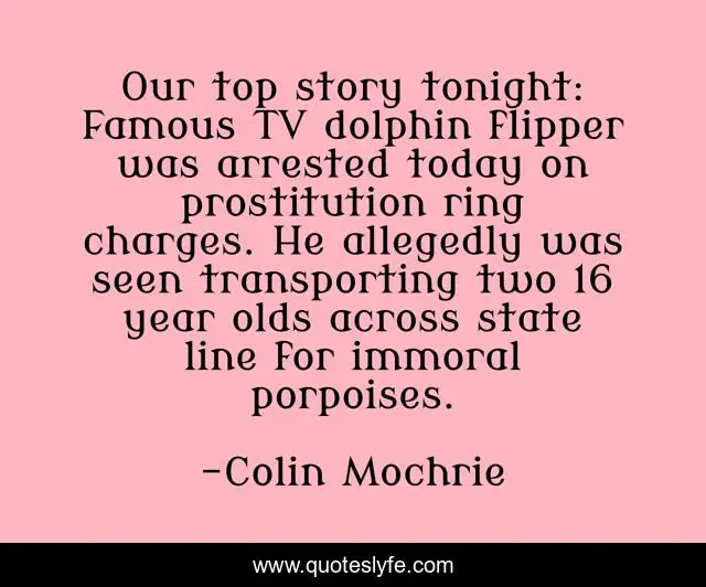 This page presents the quote "Our top story tonight: Famous TV dolphin flipper was arrested today on prostitution ring charges. He allegedly was seen transporting two 16 year olds across state line for immoral porpoises.". Author of this quote is Colin Mochrie. This quote is about story, ring, today,.