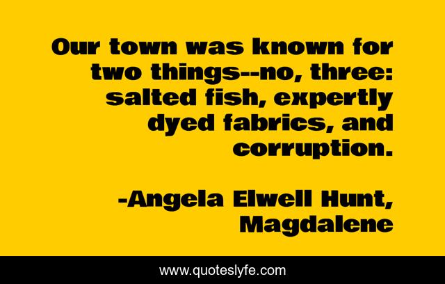 This page presents the quote "Our town was known for two things--no, three: salted fish, expertly dyed fabrics, and corruption.". Author of this quote is Angela Elwell Hunt, Magdalene. This quote is about humor, satire, cynical-humor,.