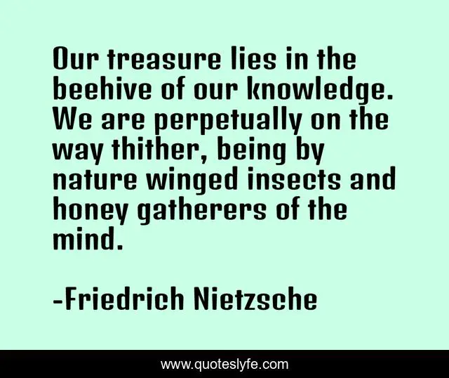 This page presents the quote "Our treasure lies in the beehive of our knowledge. We are perpetually on the way thither, being by nature winged insects and honey gatherers of the mind.". Author of this quote is Friedrich Nietzsche. This quote is about treasure, mind, knowledge,.