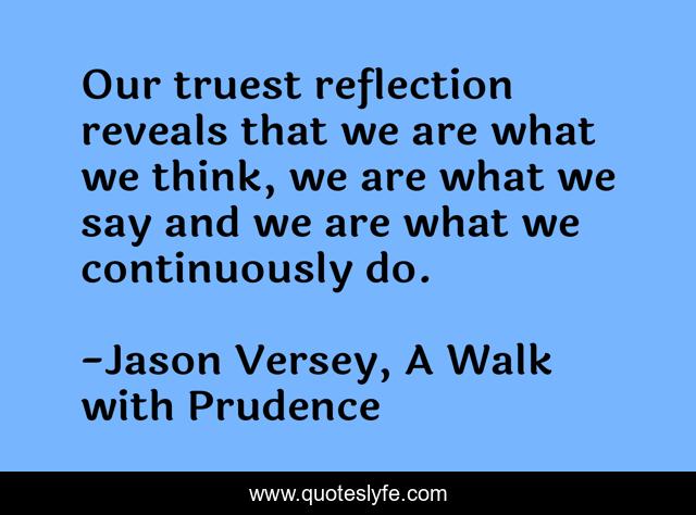 This page presents the quote "Our truest reflection reveals that we are what we think, we are what we say and we are what we continuously do.". Author of this quote is Jason Versey, A Walk with Prudence. This quote is about who-you-are, who-we-are, reflection, truth, thoughts-of-the-mind,.